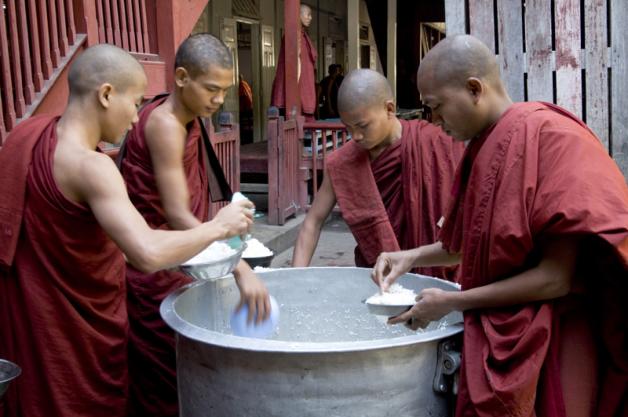 Monks helping themselves to rice from a big pot at a monastry in Kartha, Upper Irrawady, where George