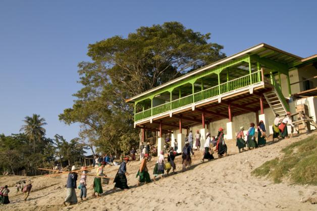 Villagers walking to the market place passed the old British Custom House in Katha.