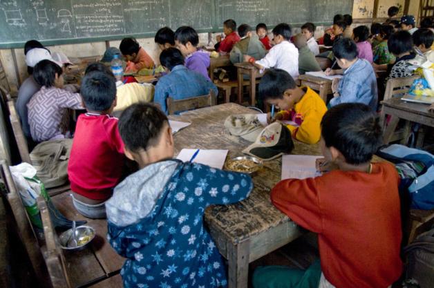 dozen tables full of eager youth and a teacher pointing to a big blackboard with Burmese numerals, drowned
