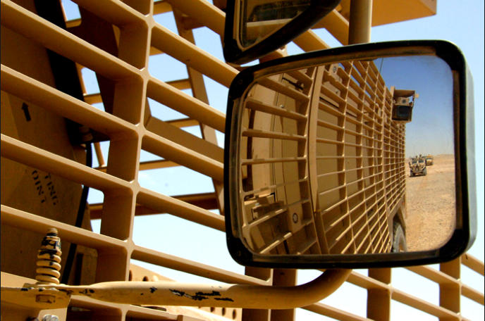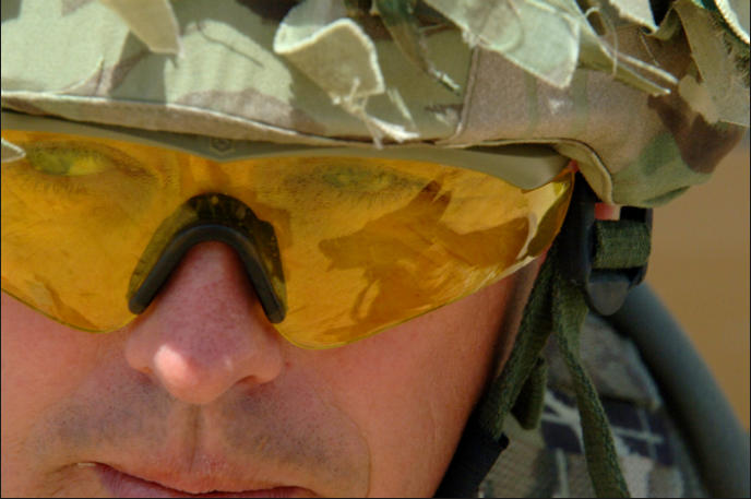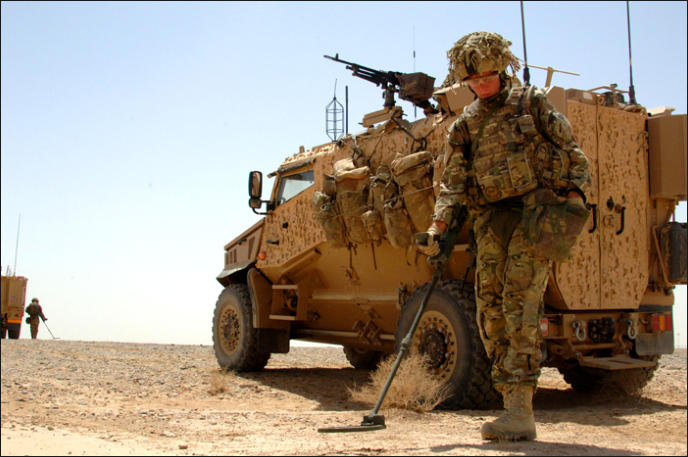 RAF force protection checking Camp Souter’s perimeter for IEDs. The hull of the IED proof British military vehicle in