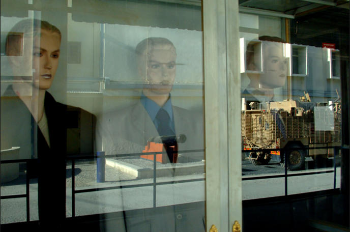 Three tailor’s dummies on display in a 6 foot high (dust proof) glass cabinet in Camp Souter, Kabul. Reflected in the