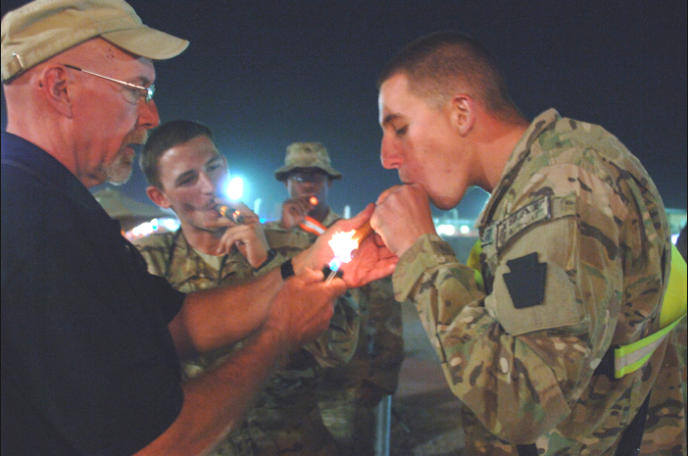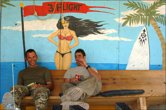 Once a week the cigar club ‘The Kandahar Coughers’ meet up near the Boardwalk at Kandahar Air Base to smoke