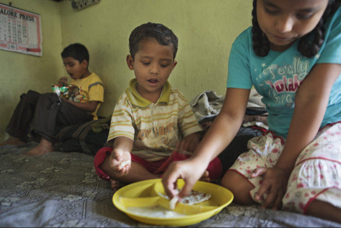 Gauri and Suraj share lunch while Suresh munches on a bag of wafers.