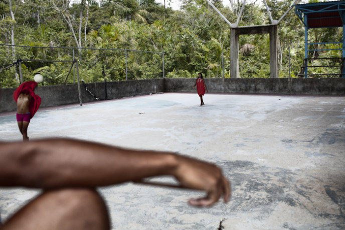 Girls playing volleyball at Murako village´s court. The court was built by the government of Venezuela in 2003. Orinoco