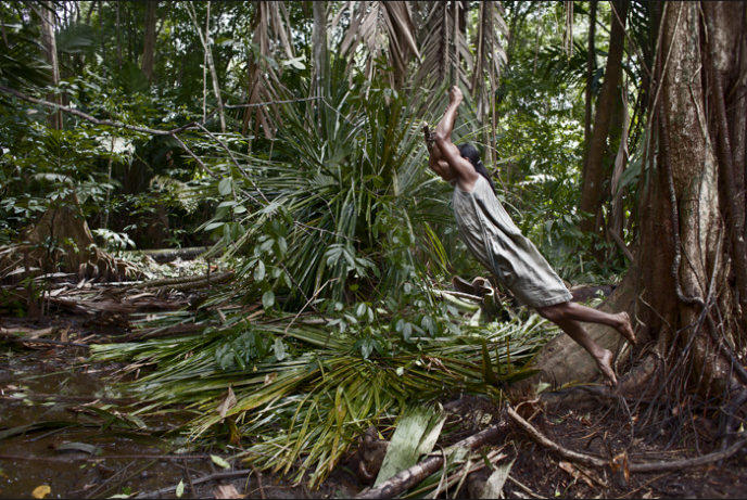 A Tidawena jumps over a puddle using a vine in the deep of the Orinoco´s swamp forest ."The Guaraons run with