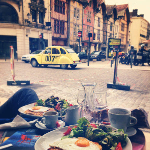 Idyllic breakfast setting - with just a touch of the surreal due to the Bond car.