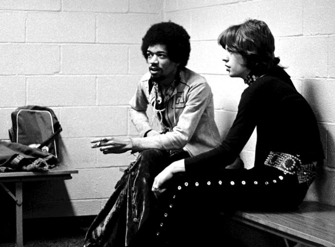 Jimi Hendrix and Mick Jagger backstage at Madison Square Garden, NYC, 1969.