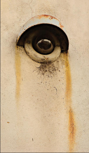 something on a wall that reminds the viewer of an eye with rust running down like tears. But upon closer examination,