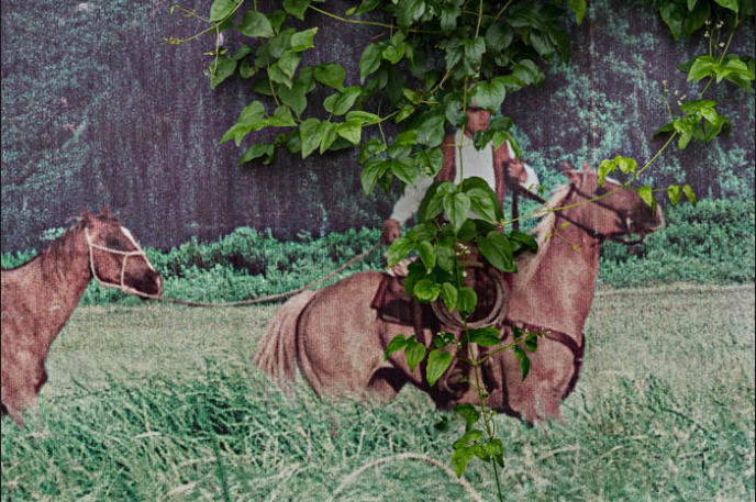 artificiality and taking them out of context. A good example is the photo-within-a-photo of a cowboy riding a horse that