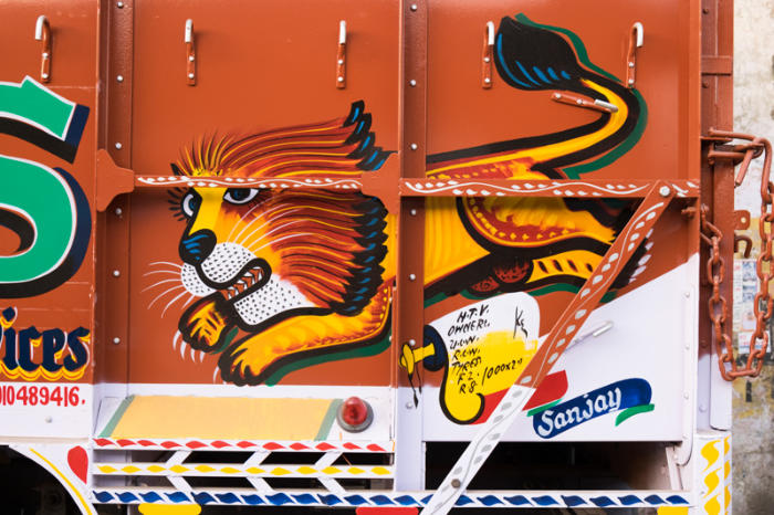 A highly decorated truck at the Sanjay Gandhi Transport Nagar.