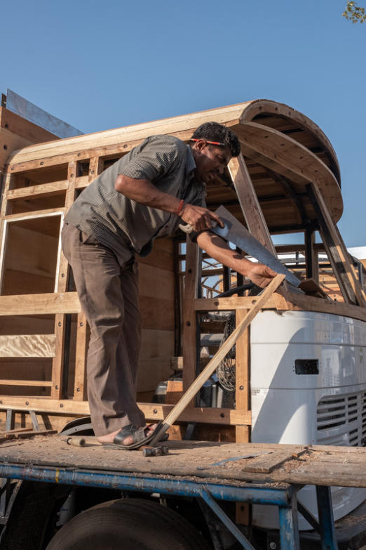 The Sanjay Gandhi transport Nagar is also home to coach builders, who work with basic hand tools and use timber and