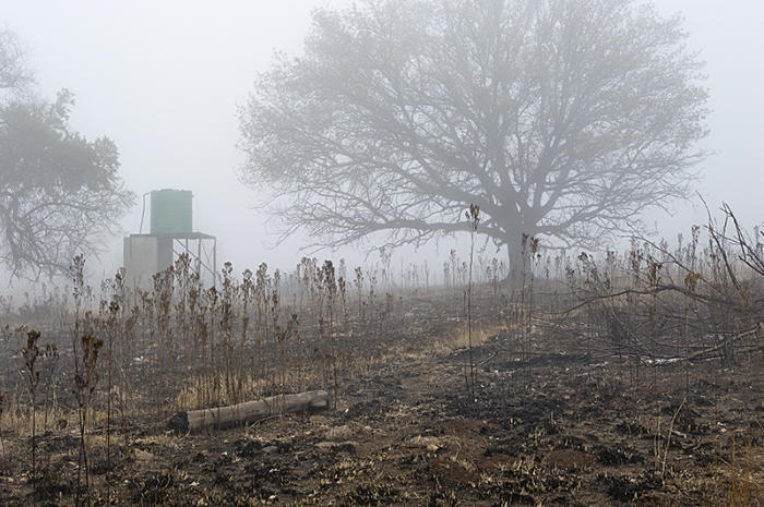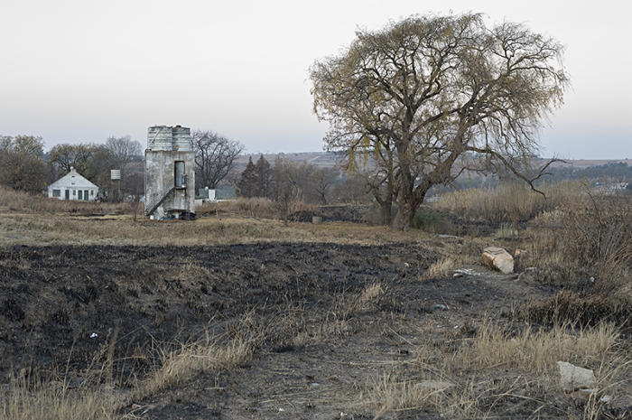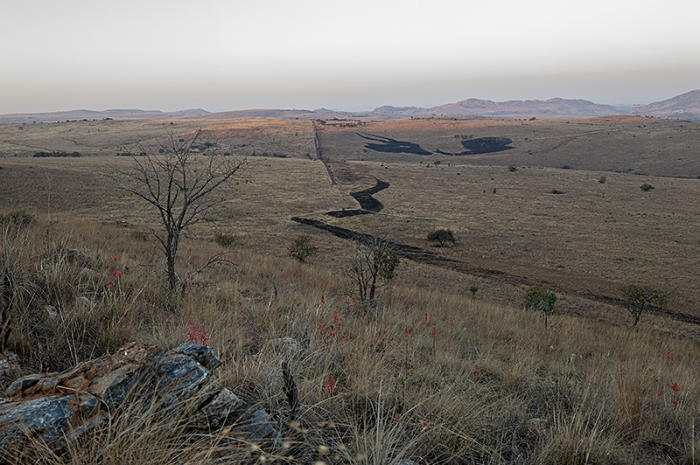 Late afternoon, Kromdraai valley. Burn sculpture by Hannelie Coetzee, Eland & Benko in the distance on Nirox