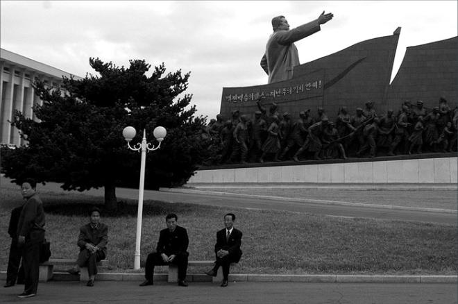 North Korean people sit by a bronze statue of Kim Il Sung in Pyongyang, capital of North Korea.