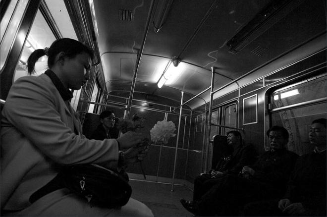 North Korean passengers in a subway carriage at a subway station in Pyongyang, capital of North Korea.