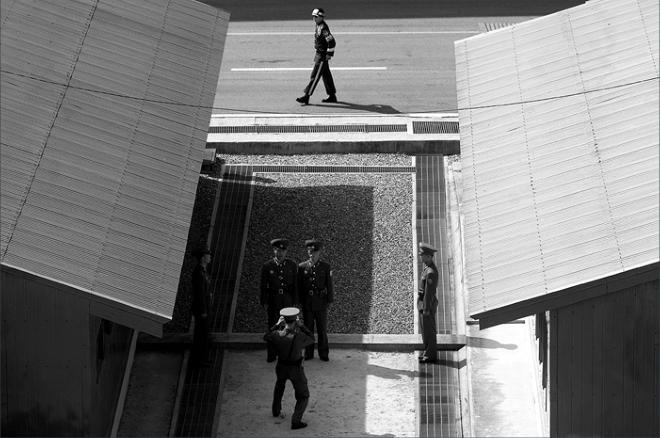 photos. A South Korean soldier guards in the distance. Photograph taken from North Korea's Panmunjom.