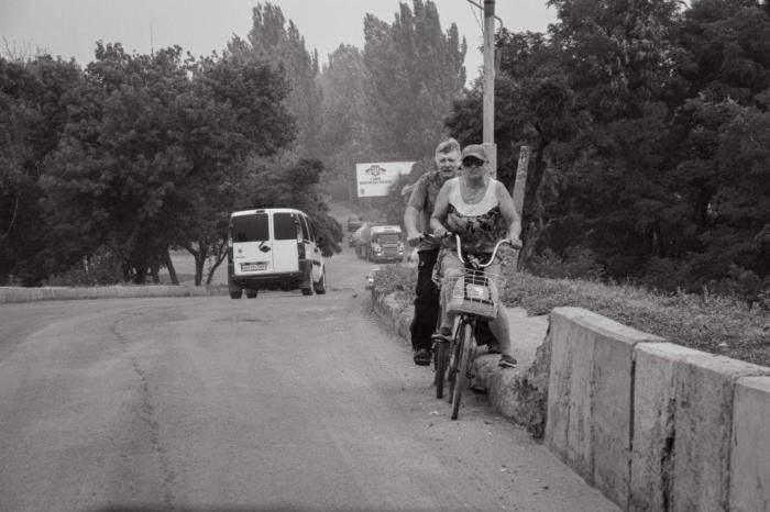 BIKE RIDE IN A WAR ZONE As we entered the Sloviansk in the Donbas, most of the people we saw on the street were riding their bikes. It was strange at first, as shelling could be heard in the distance, but what I noticed was, the people were middle-aged or older. Despite the war continuing, those determined few are still trying to go by their everyday lives as normal. In pre-war times the city had a population of over 100,000 but around 85,000 have since evacuated.