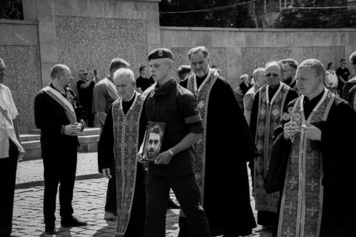 FUNERAL FOR A HERO, LVIV Military funerals have been frequent in the western city of Lviv since the war. This was the funeral of two fallen Ukrainian soldiers. Military personnel led the funeral procession followed by priests from the Ukrainian Greek-Catholic Saint Peter and Paul Garrison Church. A soldier holds up the photo of Oleg Vorobyov, 45, who was a Senior Lieutenant He died in battle in May 2022.