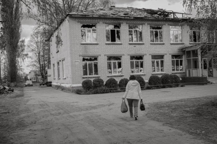 GOING HOME, BOHDANIVKA, KYIV REGION During the first weeks of the war, Russians occupied Bohdanivka, about an hour from downtown Kyiv. The Kremlin forces had planted tanks and military vehicles in the streets and gardens, destroying much in sight. After the Russians left, bus loads of residents returned. Here, a woman walks past a damaged public school as she returns home for the first time.
