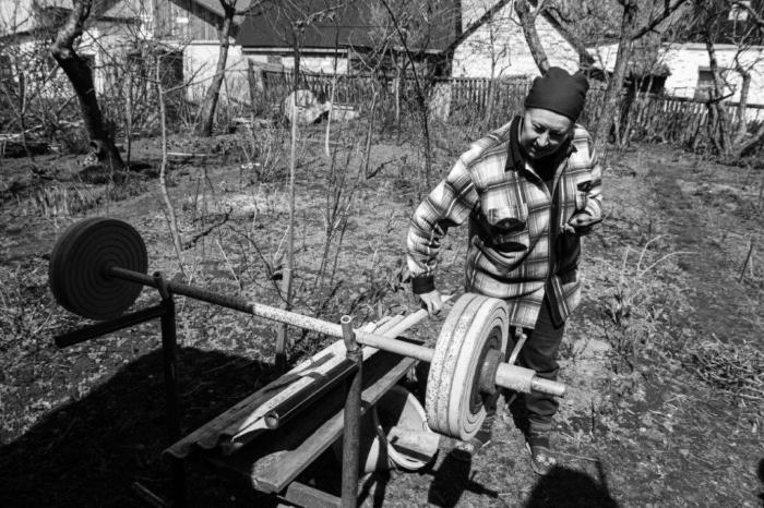 LIFE GOES ON, MAKARIV Valentina and her husband spent 40 days inside their home at the beginning of the war in February as Russian soldiers occupied Makariv, a town in Ukraine. Bullets came through the windows and remnants of shelling rained in the back yard. But despite the ordeal, she insisted her husband keep fit by using their weight bench, shown here.