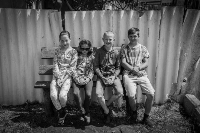 SUNSHINE AND ORANGES, MARIVKA, MYKOLAIV As we approached the village, which had previously been occupied by Russia, these Ukrainian youths were our unofficial tour guides. They introduced us to locals, showed us previously occupied houses and smiled happily in front of the camera.