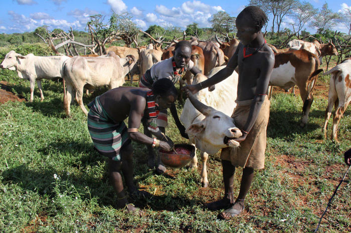 On the morning of the «Bull jumping» ceremony, members of the tribe are collecting blood from one of their bulls. They